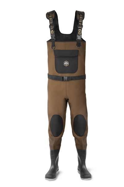 Podczas wędkowania w zimie, jedną z rzeczy, o której z pewnością należy pamiętać, jest zapewnienie ciepła. Wodery neoprenowe Delphin ORAVA są po to, aby o to zadbać. Oferują elegancki design i wysokiej jakości wykonanie, gdzie każdy szew cechuje się precyzją, aby zapobiec przeciekaniu. Dzięki brązowemu kolorowi, śluz i inne plamy nie będą tak widoczne. Z przodu znajduje się neoprenowa kieszeń do przechowywania drobnych przedmiotów – jak na przykład karta wędkarska. Nie musisz się również martwić o kolana, ponieważ wodery są wzmocnione podwójną warstwą neoprenu w tych częściach. Regulowane paski na ramiona wyposażone są w neoprenową wyściółkę dla lepszego komfortu podczas Twoich niekiedy całodziennych wypraw wędkarskich. Pod szelkami znajdują się dwa plastikowe pierścienie, do których możesz przymocować na przykład metrówkę lub szczypce. W pakiecie znajduje się pas do brodzenia, który zapobiega przedostawaniu się wody do wnętrza woderów w razie poślizgnięcia lub upadku. Gumowe kalosze mają trwałe i stabilne podeszwy, które wytrzymają najtrudniejsze warunki. Są wyłożone neoprenowymi wkładkami dla lepszej ochrony przed zimnem.