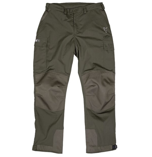 Spodnie Fox posiadają wzmocnione, wyprofilowane panele na kolanach z poliestru typu Oxford 300D. Wzmocniony panel na siedzeniu z poliestru typu Oxford 300D. Szlufki na pasek, sześć kieszeni, rozporek zapinany na zamek. Regulowane paski na rzepy na kostkach.